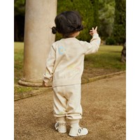 Strikcardigan til de mindste i økologisk bomuld. Cardiganen har raglanærmer, ribkanter og en rund halsudskæring. Strikken er beige med blomster på. Kombinér med de matchende bukser for et komplet outfit.