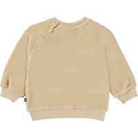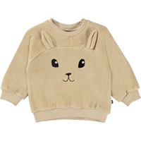 Beige bluse i blød bomuldsvelour, til de mindste. Blusen har et lille kaninansigt med påsyede ører på maven. Denne bluse er fremstillet i 100% bomuld, har en rund halsudskæring med ribkant, raglanærmer, ribkant ved ærmer og hofte, samt trykknapper ved halsen, så blusen er let at få af og på. Match evt. trøjen med bukserne, Sigo, i samme farve og kvalitet, for det perfekte sæt.