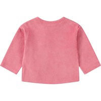 Pink bluse i blød riflet fløjl til de mindste. Blusen har en rund halsudskæring med to knapper, hvilket gør den nem at få af og på. Den har også lange ærmer og en kængurulomme på fronten.