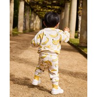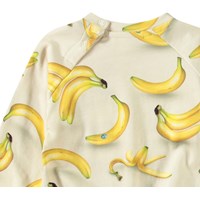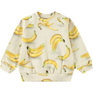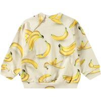 Blød sweatshirt til de mindste i økologisk bomuld. Sweatshirten har raglanærmer, ribkanter og en rund halsudskæring med knaplukning bag skulderen, hvilket gør den nem at tage af og på. Denne style har en ubørstet inderside, hvilket gør den dejlig kølig på en varm dag. Beige med bananprint. Kombinér med de matchende bukser for et komplet outfit.