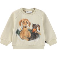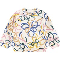 Blå sweatshirt til de mindste i blødt økologisk bomuld med et med print af ansigter i forskelligt humør. Sweatshirten har raglanærmer, ribkant ved hofte og ærmer samt en rund halsudskæring med to trykknapper i nakken, hvilket gør den nem at få af og på. kombiner med matchende bukser for et komplet sæt.