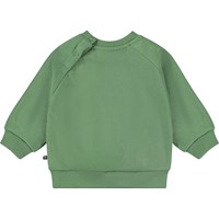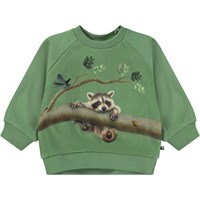 Grøn bluse med placement print til de mindste. På printet ses en lille vaskebjørneunge, der prøver at kravle op på en gren. Måske vil han op til sin ven, sølvsmeden. Denne bluse er fremstillet i 100% bomuld, har en rund halsudskæring med ribkant, raglanærmer, ribkant ved ærmer og hofte, samt trykknapper ved halsen, så blusen er let at få af og på. Match evt. denne trøje med bukserne, Simeon, i printet "Animal Living" for det perfekte sæt.