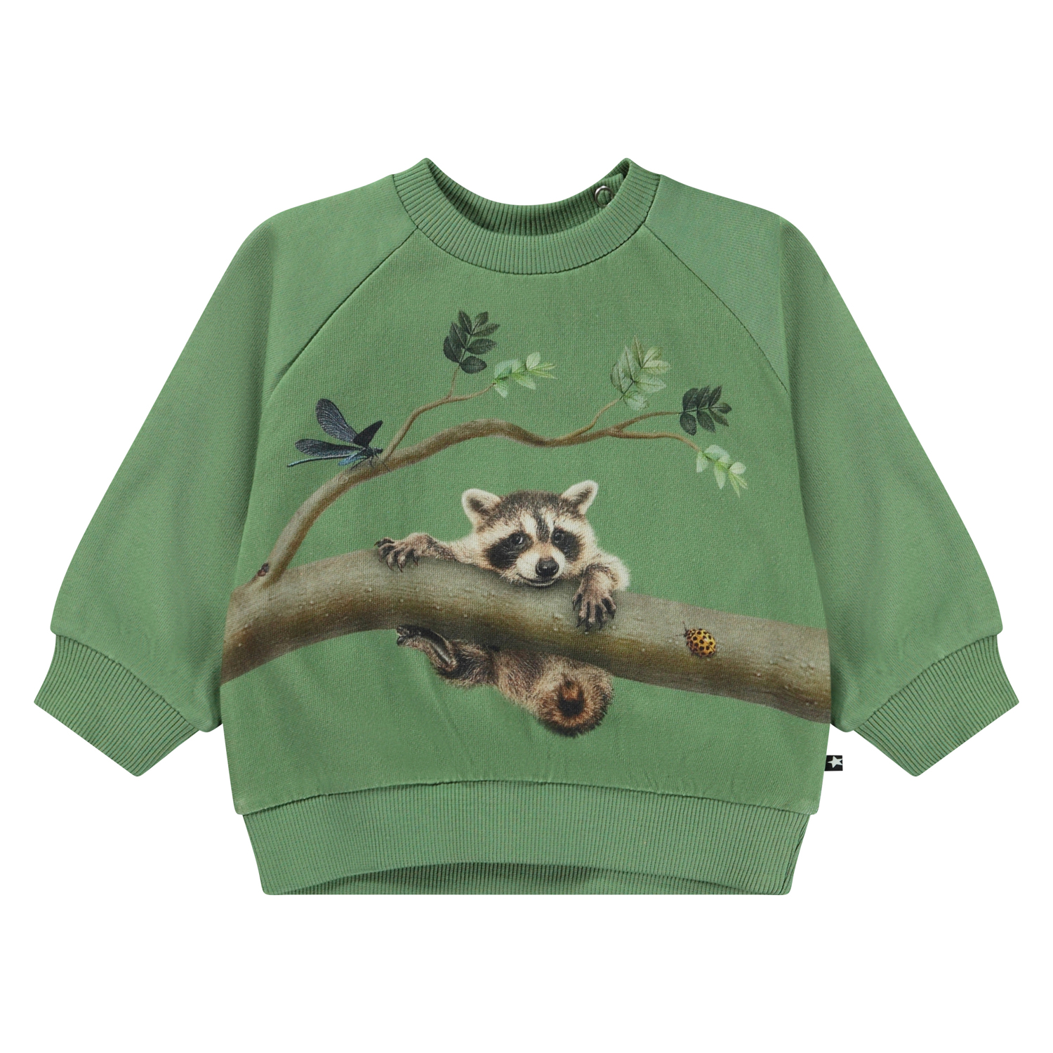 Grøn bluse med placement print til de mindste. På printet ses en lille vaskebjørneunge, der prøver at kravle op på en gren. Måske vil han op til sin ven, sølvsmeden. Denne bluse er fremstillet i 100% bomuld, har en rund halsudskæring med ribkant, raglanærmer, ribkant ved ærmer og hofte, samt trykknapper ved halsen, så blusen er let at få af og på. Match evt. denne trøje med bukserne, Simeon, i printet "Animal Living" for det perfekte sæt.