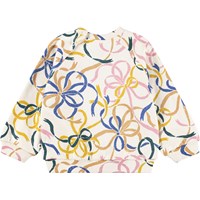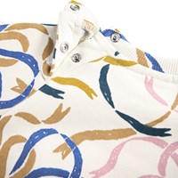 Råhvid sweatshirt til de mindste i blødt økologisk bomuld med et med farverigt print med print af farverige bånd. Sweatshirten har raglanærmer, ribkant ved hofte og ærmer samt en rund halsudskæring med to trykknapper i nakken, hvilket gør den nem at få af og på. kombiner med matchende bukser for et komplet sæt.