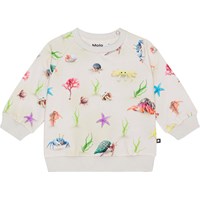 Råhvid sweater til de mindste i økologisk bomuldsjersey. Sweateren har ribkant ved hofte og ærmer samt en rund halsudskæring med to trykknapper i nakken der gør den er nem at få af og på. Bukserne har et sort alloverprint af glade hoppende noder. Kombiner denne style med matchende bukser og få et komplet og blødt jerseysæt.