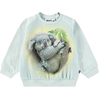 Blød sweatshirt til de mindste i økologisk bomuld. Sweatshirten har raglanærmer, ribkanter og en rund halsudskæring med knaplukning bag skulderen, hvilket gør den nem at få af og på. Denne style har en ubørstet inderside, hvilket gør den dejlig kølig på en varm dag. Denne sweatshirt er lyseblå med sødt print af en koalabjørn.