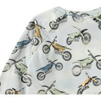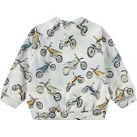 Blød sweatshirt til de mindste i økologisk bomuld. Sweatshirten har raglanærmer, ribkanter og en rund halsudskæring med knaplukning bag skulderen, hvilket gør den nem at tage af og på. Denne style har en ubørstet inderside, hvilket gør den dejlig kølig på en varm dag. Denne sweatshirt er lysegrå med motocross-print. Kombinér med de matchende bukser for et komplet outfit.