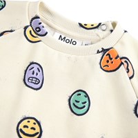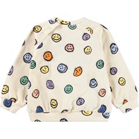 Råhvid sweatshirt til de mindste i blødt økologisk bomuld med et med farverigt print af ansigter i forskelligt humør. Sweatshirten har raglanærmer, ribkant ved hofte og ærmer samt en rund halsudskæring med to trykknapper i nakken, hvilket gør den nem at få af og på. kombiner med matchende bukser for et komplet sæt.