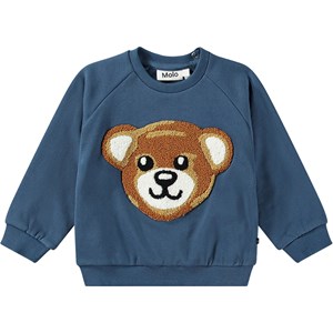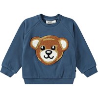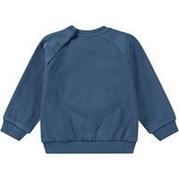 Mørkeblå sweatshirt til de mindste i økologisk bomuldsjersey med en børstet inderside, der gør den dejligt blød og varm at have på. Sweatshirten har raglanærmer og ribkant ved hofte og ærmer. Den har også en rund halsudskæring med to trykknapper i nakken, hvilket gør den nem at få af og på. På fronten af sweatshirten er der et sødt broderi af en bamse.