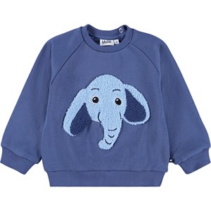 Blå sweatshirt til de mindste i blødt økologisk bomuld med et broderet elefantansigt på fronten. Sweatshirten har raglanærmer, ribkant ved hofte og ærmer samt en rund halsudskæring med to trykknapper i nakken, hvilket gør den nem at få af og på. kombiner med matchende bukser for et komplet sæt.