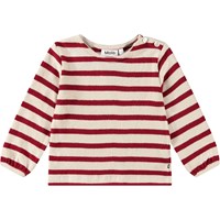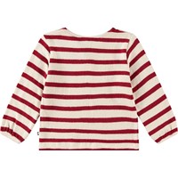 Rød- og hvidstribet bluse i økologisk bomuld til de mindste. Blusen har en rund halsudskæring med to knapper, hvilket gør den nem at få af og på. Den har også lange ærmer med elastik i enden.