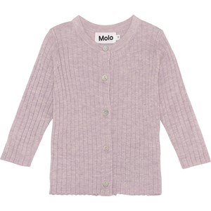 Georgette er en flot ribstrikket baby cardigan med cashmere i lyselilla. Cardiganen har smukke perlemorsknapper hele vejen ned Kombinere med matchende ribstrikkede bukser.