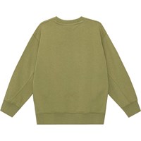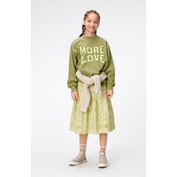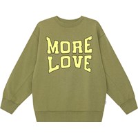 Olivengrøn sweatshirt med 'More Love' trykt på fronten. Sweatshirten har lave skuldersøm og lange ærmer, rund hals og ribkanter.