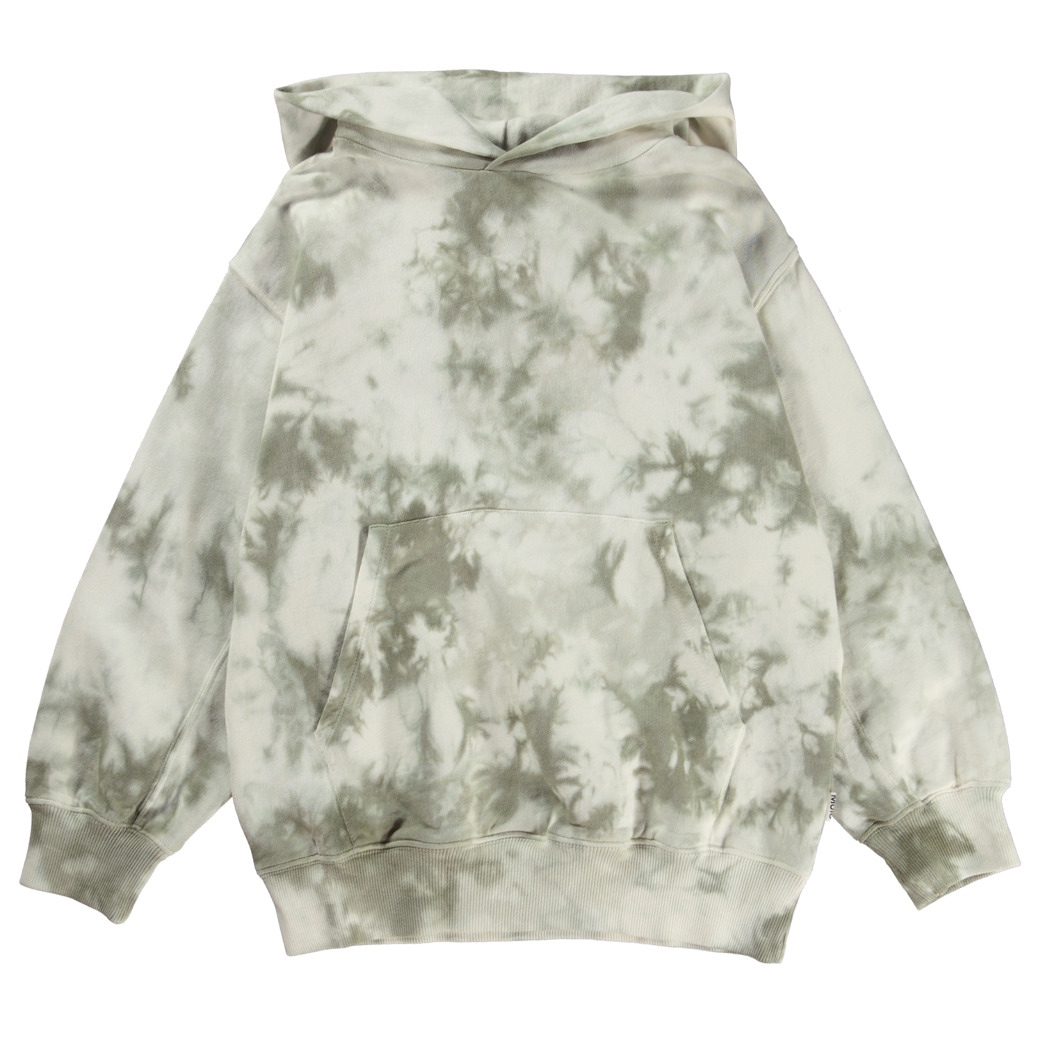 Maxx er en unisex hættetrøje med tie-dye mønster i beige og grøn. Hættetrøjen har kængurulomme på fronten og ribkant ved bund og ærmeafslutning. Alt Molos tie-dye er håndlavet og hvert produkt har derfor sit eget unikke udtryk.