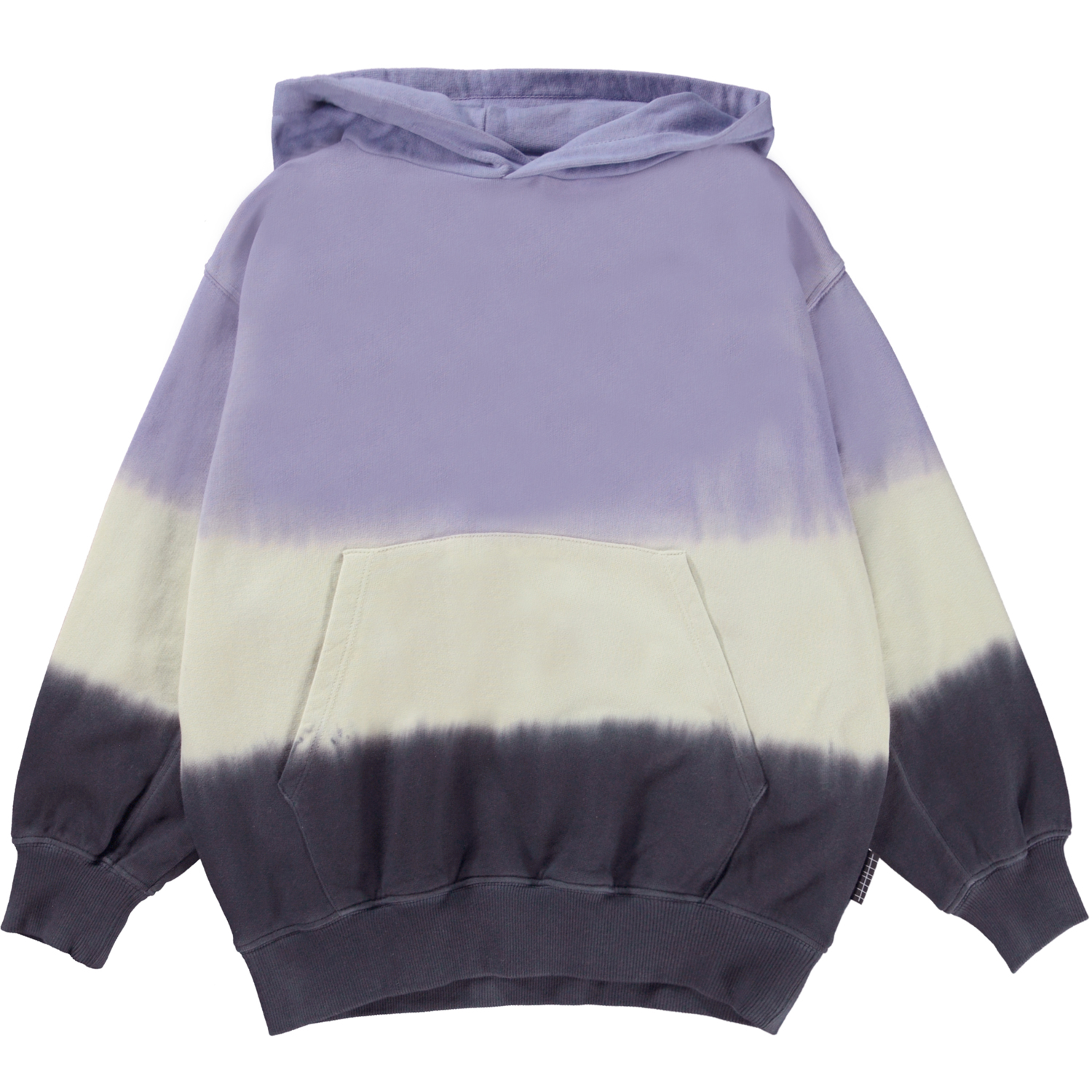 Maxx er en unisex hættetrøje med brede tie-dye striber i lilla, hvid og grå. Hættetrøjen har kængurulomme på fronten og ribkant ved bund og ærmeafslutning. Alt Molos tie-dye er håndlavet og hvert produkt har derfor sit eget unikke udtryk.