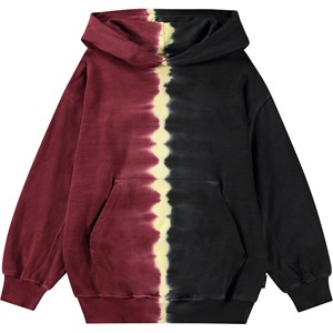 Sort, bordeaux og gul tie-dye hoodie i økologisk bomuld med en børstet inderside, der gør den dejligt blød og varm at have på. Trøjen har en oversize pasform, hætte, kængurulomme og ribkant ved håndled. Alt vores tie-dye er håndlavet, hvilket skaber et unikt mønster, der varierer fra style til style.