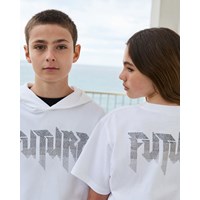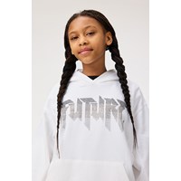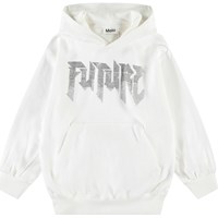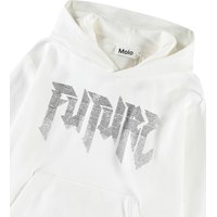 Hvid oversize hættetrøje i blødt økologisk bomuld med kængurulomme og ribkanter. Trøjen har teksten 'Future' på fronten, skrevet med glitrende similisten.