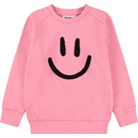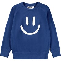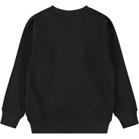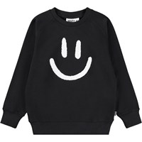 Sort sweatshirt i blødt økologisk bomuld med raglanærmer, ribkanter ved hals, ærmer og i bunden af blusen. Sweatshirten har en løs pasform med et hvidt og blødt smilende broderi på fronten.