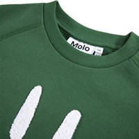 Grøn sweatshirt i blødt økologisk bomuld med raglanærmer, ribkanter ved hals, ærmer og i bunden af blusen. Sweatshirten har en løs pasform med et hvidt og blødt smilende broderi på fronten.