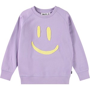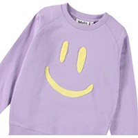 Lilla sweatshirt i blødt økologisk bomuld med raglanærmer, ribkanter ved hals, ærmer og i bunden af blusen. Sweatshirten har en løs pasform med et gult og blødt smilende broderi på fronten. Kombiner med matchende shorts og få et komplet sæt.