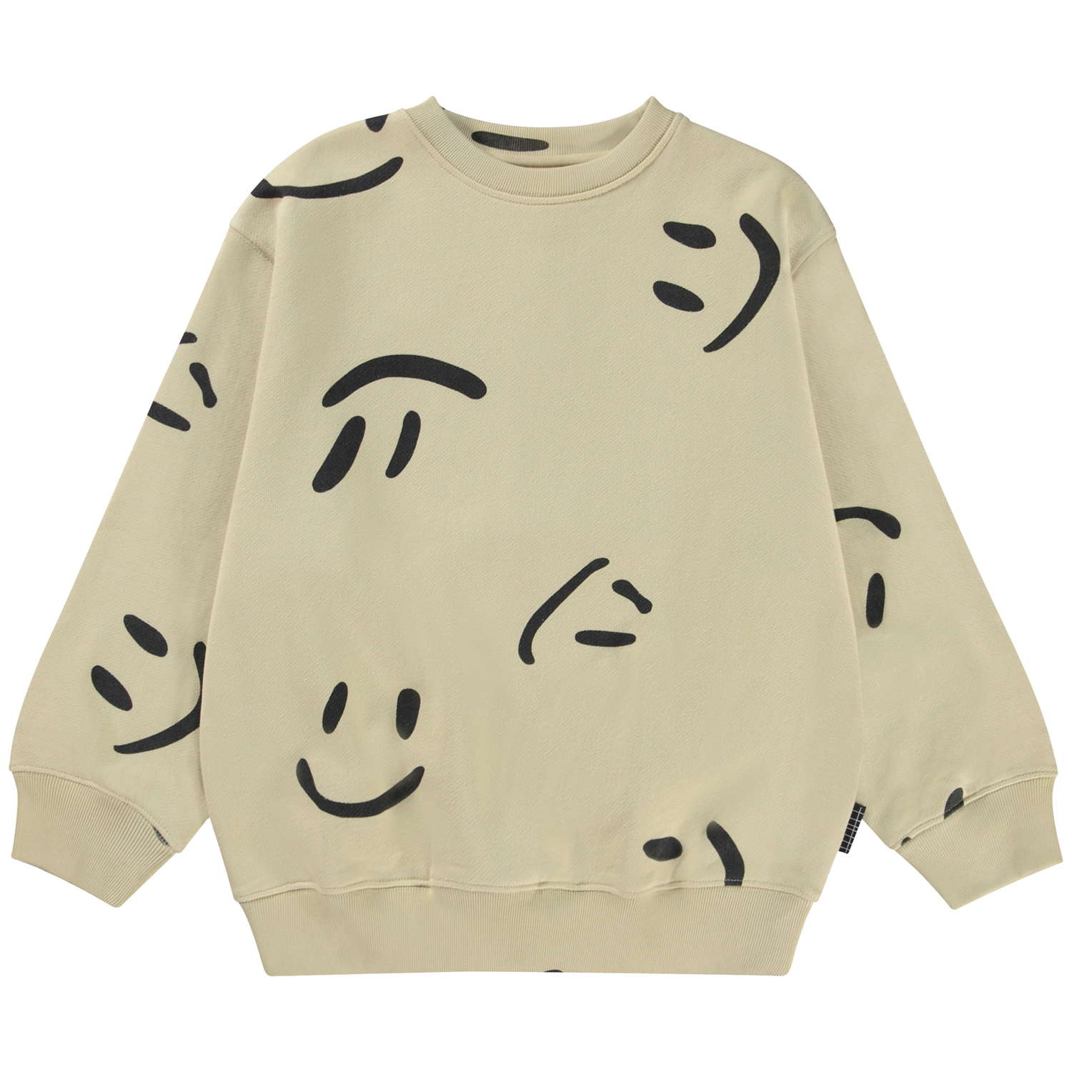 Beige sweatshirt med sort allover print. På printet ses store smilende ansigter, som bare er glade dagen lang. Denne sweatshirt er fremstillet i 100% bomuld, har rund halsudskæring med ribkant, ribkant ved hånd og hofte, samt et loose fit. Match evt. denne sweatshirt med bukserne, Adan, i samme print for det perfekte sæt.