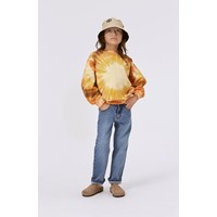 Gul sweatshirt med placement print. Printet er et tie-dye print i gule og orange nuancer, der stråler ligesom solen. Sweatshirten har også et lille front print med budskabet "Shine On". Denne sweatshirt er fremstillet i 100% bomuld, har rund halsudskæring med ribkant, ribkant ved hånd og hofte, samt et loose fit.