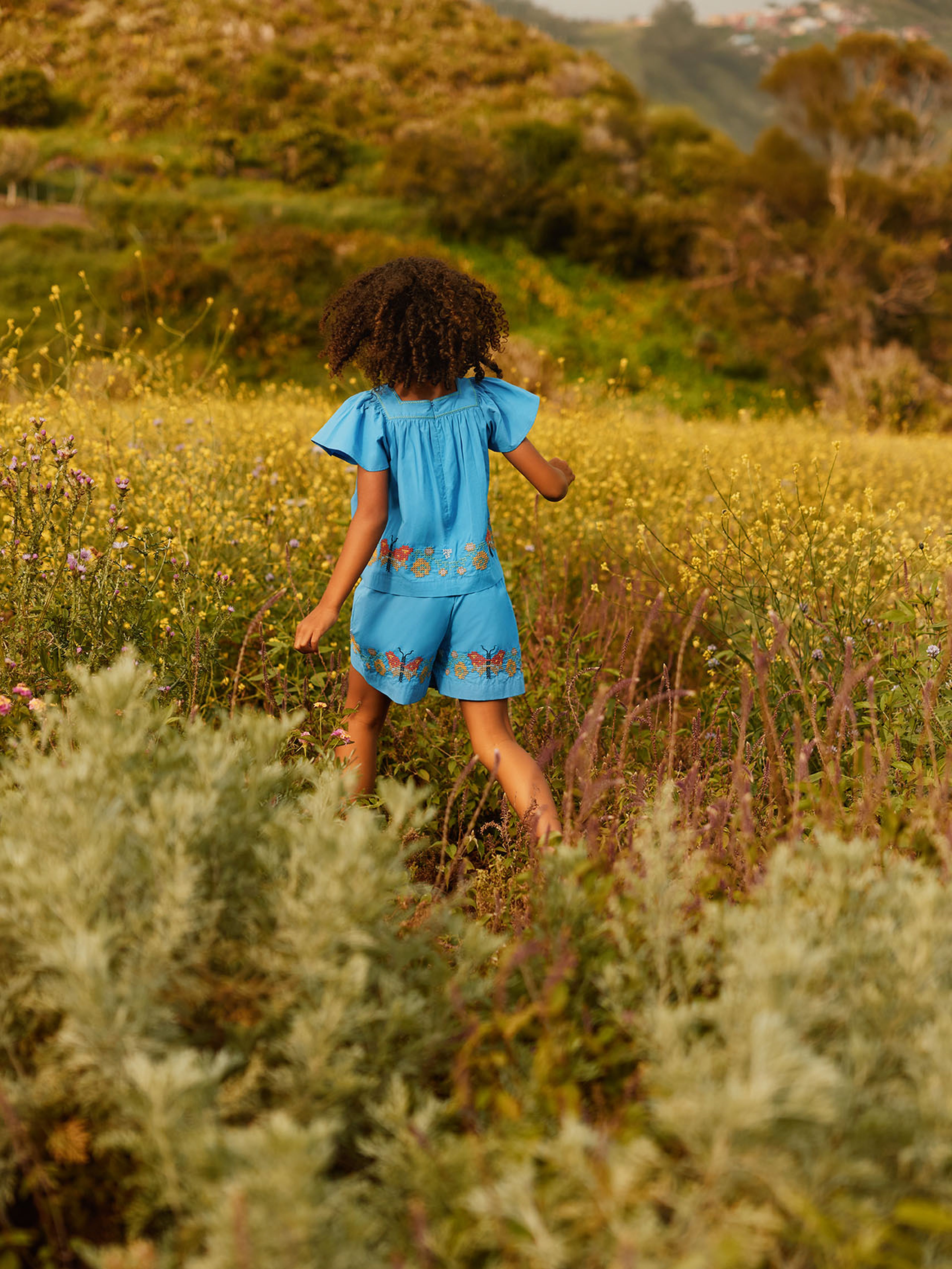 Farverige insekter og smukke blomstermotiver kommer til live gennem detaljer som korssting og broderi. Stærke røde og blå farver binder historien sammen - en hyldest til historie, natur og håndarbejde.