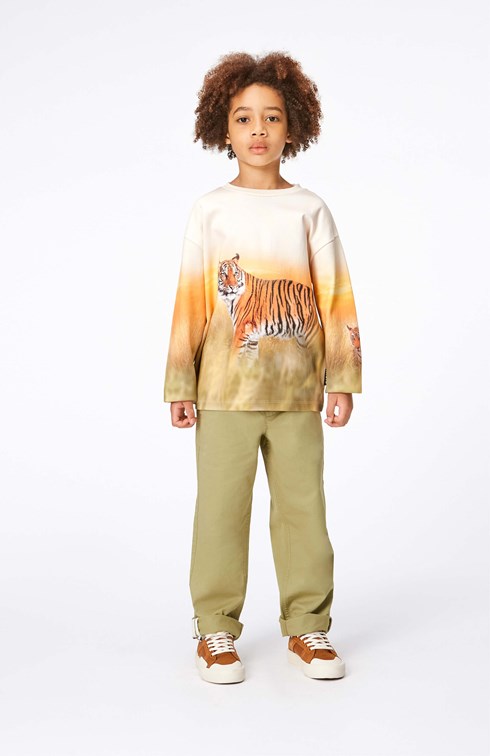 Mosgrønne chinosi bomuld. Disse bukser har lommer i siderne, baglommer, logolabel i linningen over den ene baglomme, samt en almindelig pasform. Buksernes livvidde kan justeres med en indvendig justerbar elastik, så de passer perfekt til alle børn. Str.92-134 har trykknap, så bukserne er nemme at få af og på - str.140-176 har regulær jeansknap.