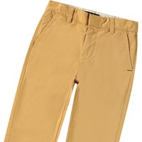 Lysebrune chinos i økologisk bomuld. Bukserne har to sidelommer, en almindelig pasform og lukkes med en hægte. Livvidden kan justeres med en indvendig elastik, så de passer perfekt til alle børn.