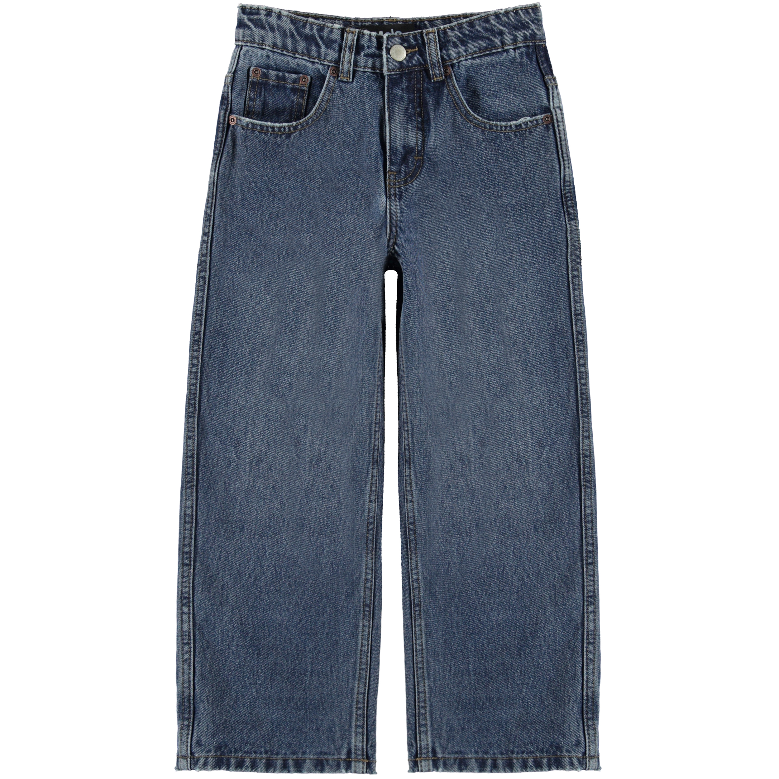 Aiden er Molo's nye jeans i blå, som har en cool og ekstra bred pasform med inspiration hentet fra skater miljøet. Den rummelige pasform og den brede vidde i benene, gør bukserne nemme at bevæge sig i. Buksernes livvidde kan justeres med en indvendig justerbar elastik, så de passer perfekttil alle børn. Aiden er fremstillet i 100% bomuld, hvilket gør at bukserne er ekstra slidstærke. Bemærk, at størrelserne til og med 134 har trykknap og ikke almindelig jeansknap.