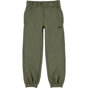 Am er et par khaki grønne sweatpants med Molo logo på fronten og 'One world' print over baglommen. Bukserne har elastisk talje og benafslutning. Certificeret af Ecocert Greenlife, certifikationsnr. 197496.