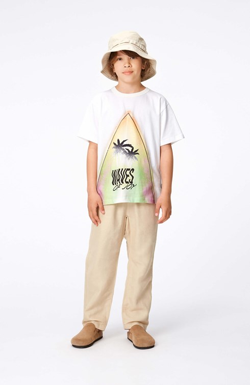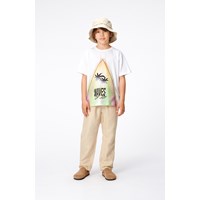 Sandfarvede bukser, fremstillet i en let og luftig hør/bomuldskvalitet. Disse bukser har elastik og indvendigt bindebånd i taljen, lommer i siden, en enkelt baglomme, samt en almindelig pasform.