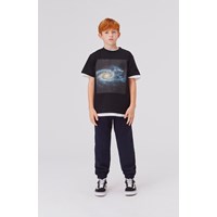 Amse er et par to farvede sweatpants med mørkeblå forside og sort bagside. Bukserne har elastisk talje og benafslutning.