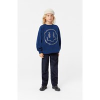 Mørkeblå bukser i riflet fløjl med lommer og baglommer. Bukserne har stretch og en almindelig pasform.
