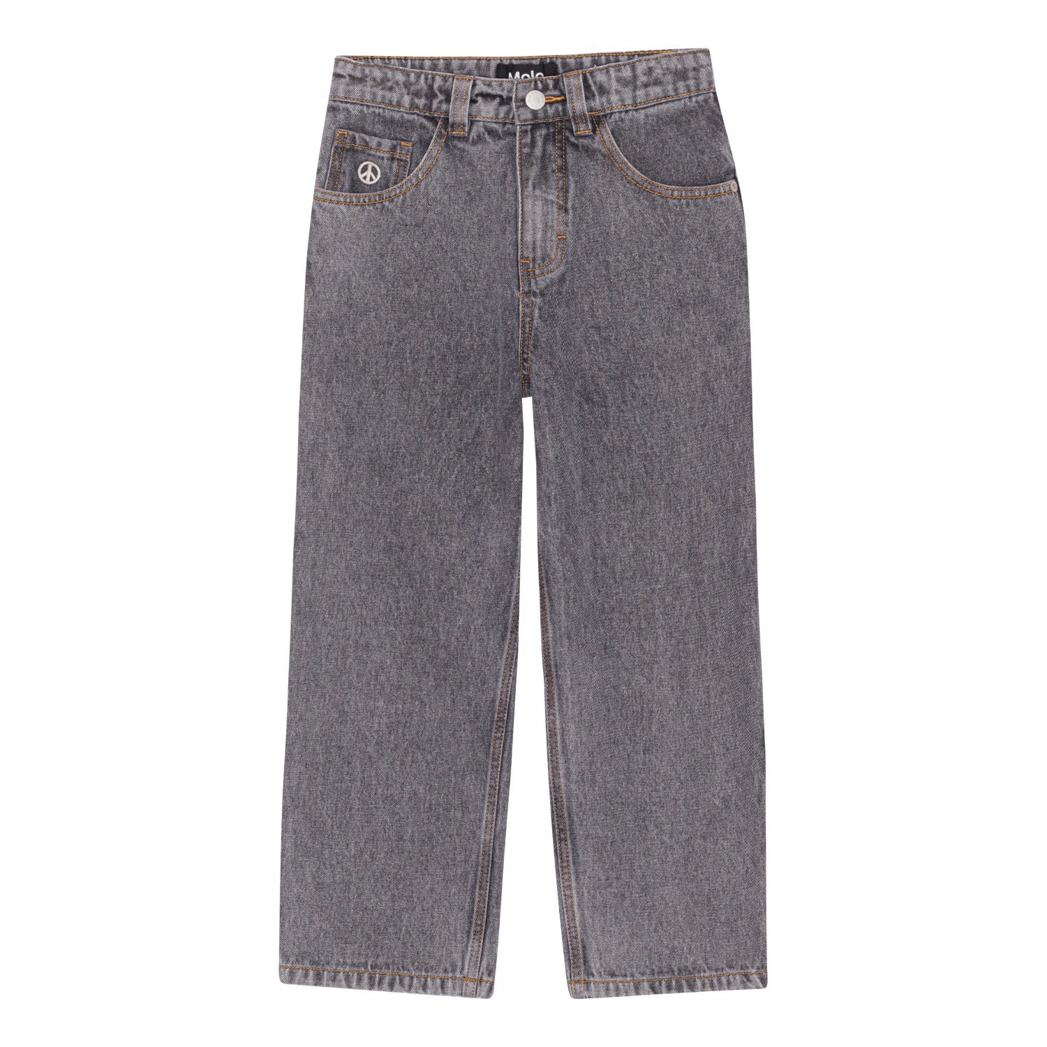 Grå jeans med peacetegn på lommen, fremstillet i en blød og slidstærk bomuldskvalitet. Disse jeans har lommer i siderne, baglommer, samt et oversize fit. Buksernes livvidde kan justeres med en indvendig justerbar elastik, så de passer perfekt til alle børn. Str.92-134 har trykknap, så bukserne er nemme at få af og på - str.140-176 har regulær jeansknap.