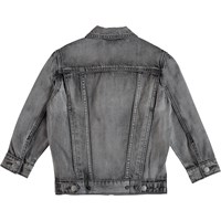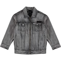 Grå denim jakke i forvasket look med krave, lynlås ned langs fronten og to lommer forneden.