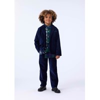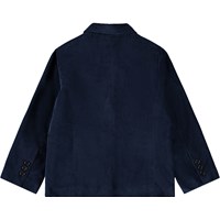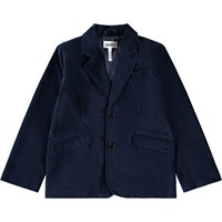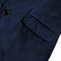 Mørkeblå velourjakke i blød bomuld med knaplukning foran og knapper ved reverset. Jakken er designet med to praktiske sidelommer, der gør den både elegant og funktionel.