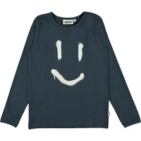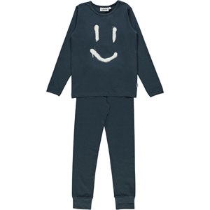 To delt nattøjssæt i blå med print af smiley på blusen. Bukserne har bindebånd i livet og blusen har lange ærmer. Certificeret af Ecocert Greenlife, certifikationsnr. 197496.