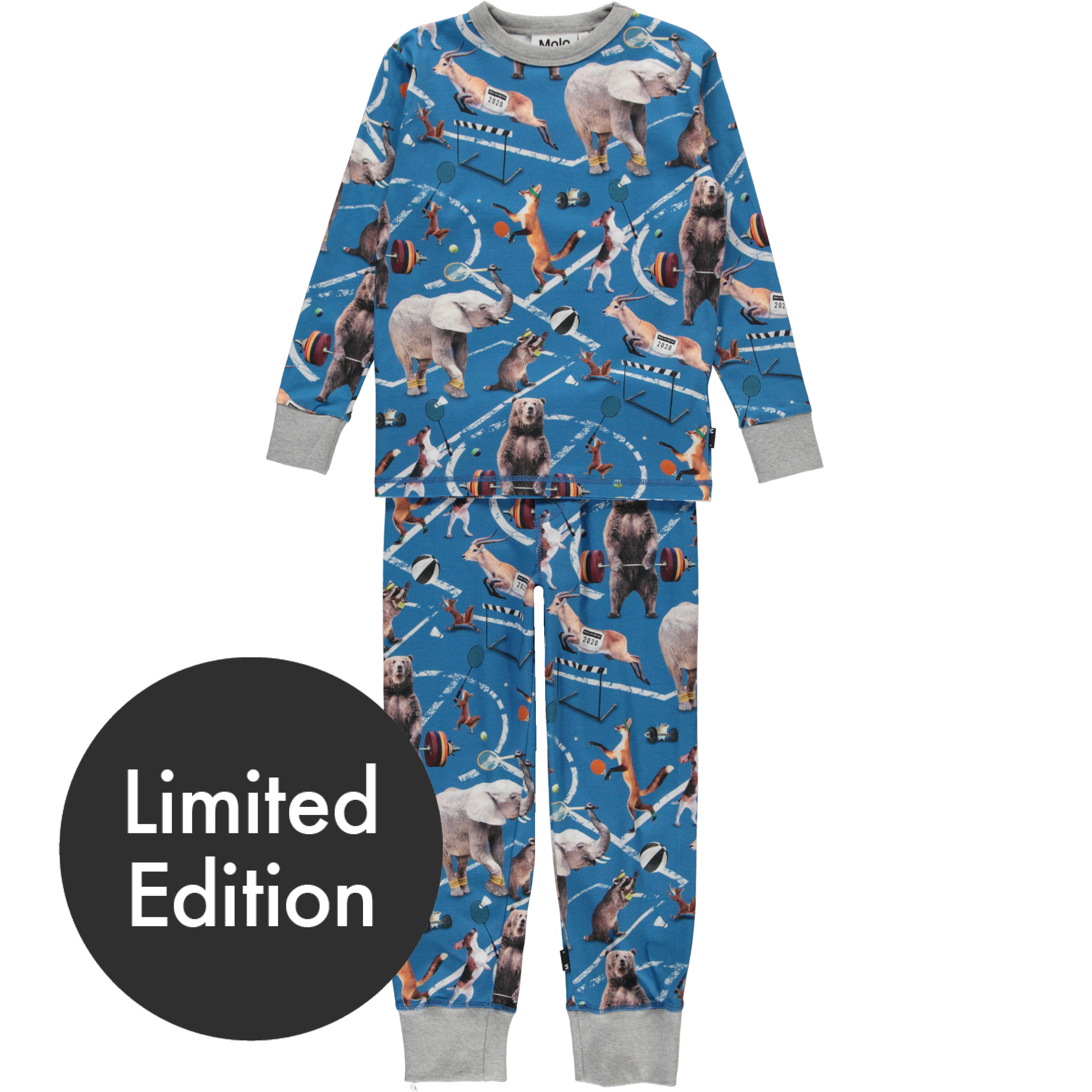 To-delt natsæt fremstillet i blød økologisk bomuld med rund halsudskæring og elastik i taljen.