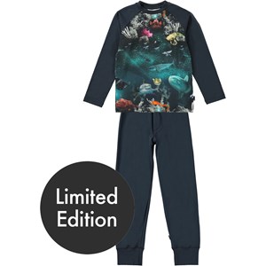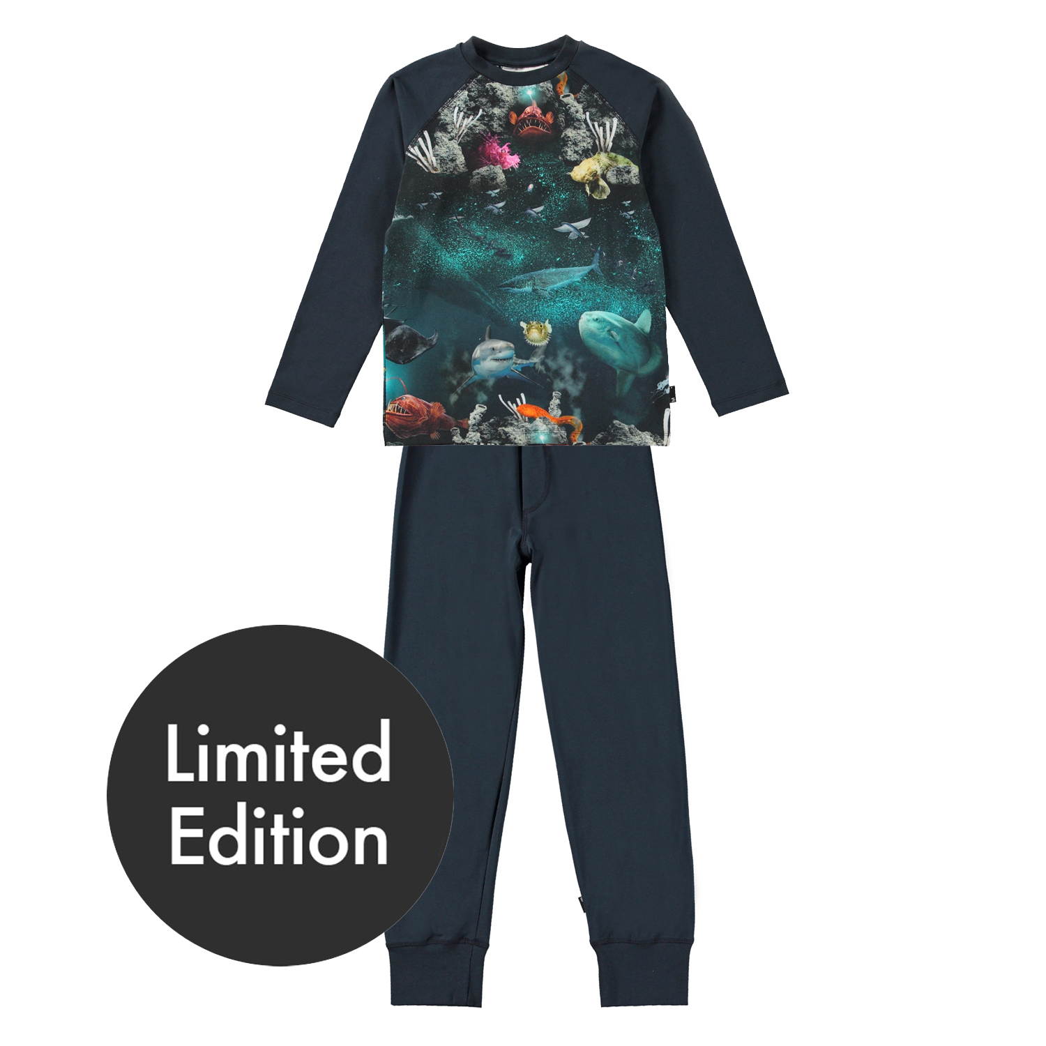 To-delt natsæt fremstillet i blød økologisk bomuld med rund halsudskæring og elastik i taljen.