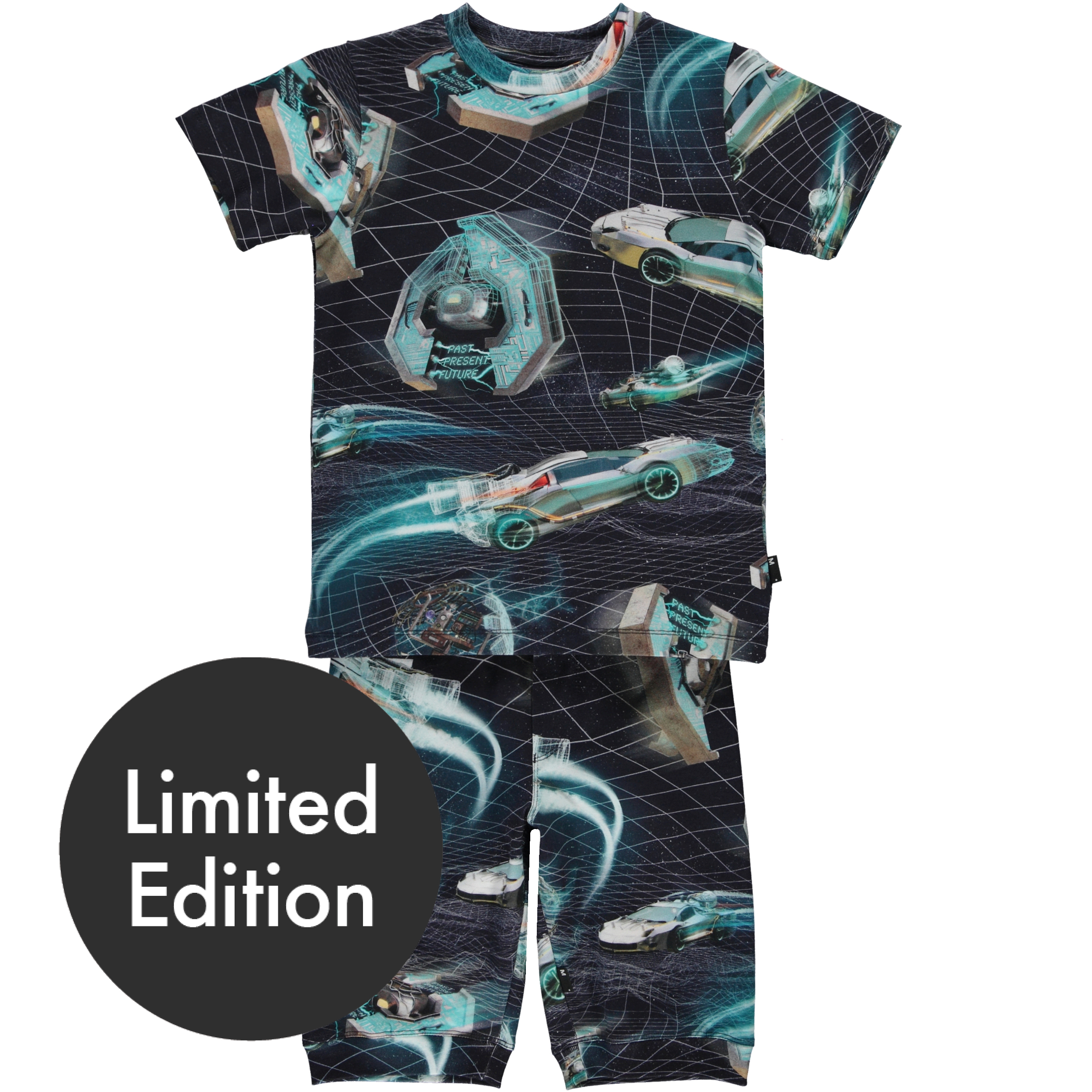 T-shirten har en normal pasform og den bløde buks går til over knæet med elastik i taljen. Anvendelig når der skal hygges og slappes af eller komforten skal være i højsæde.