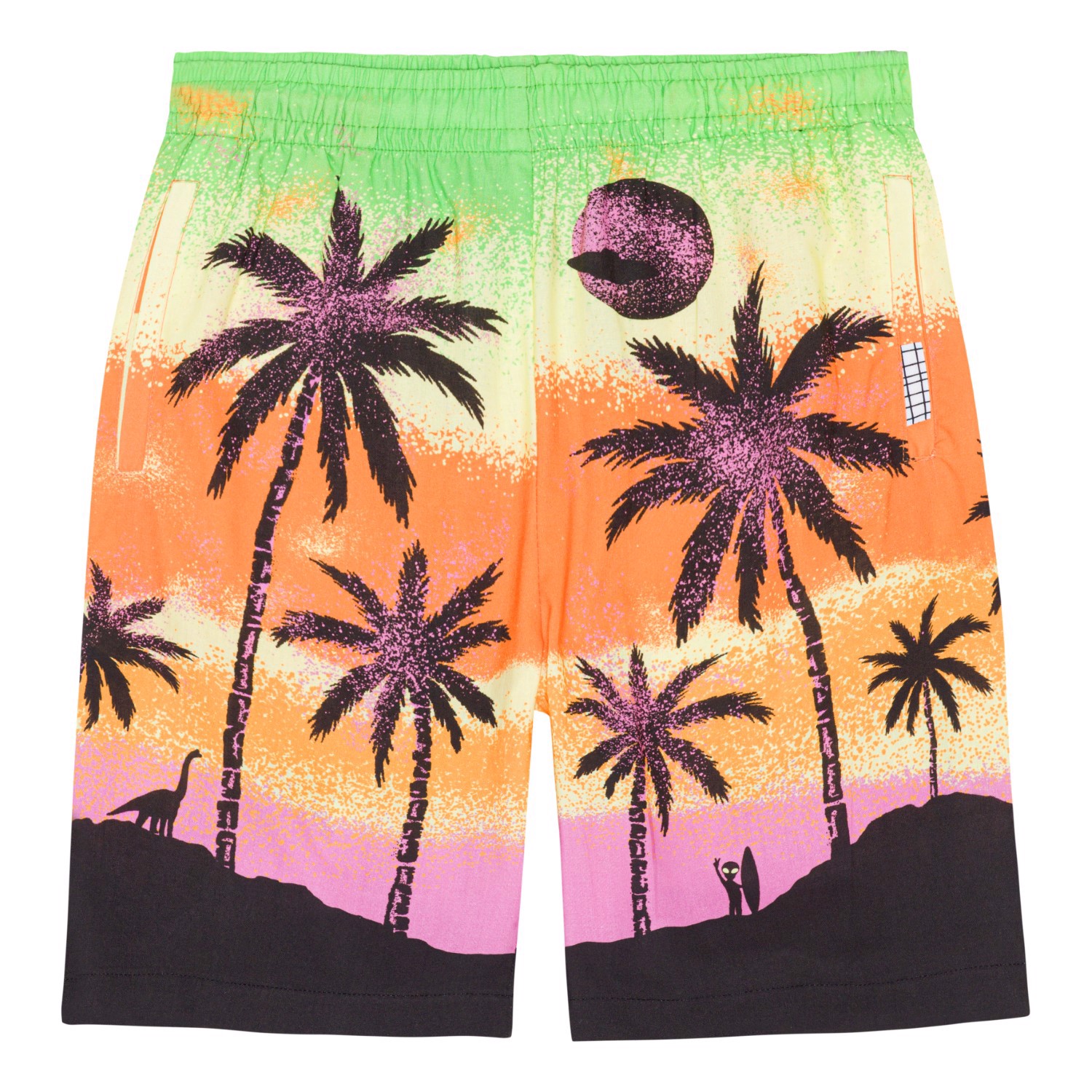Knælange shorts med placementprint i økologisk bomuld. Printet er et klassisk Hawaiiprint med et twist, palmer og solnedgang, i sort, orange, grøn og lilla nuancer. Måske du kan spotte en surfer alien, eller andre gæster? Disse shorts har en elastisk talje med indvendigt bindebånd, lommer i siden, samt en almindelig pasform. For et ekstra cool look, kombinér evt. med matchende skjorte, Rui, i samme print.