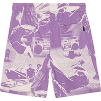 Shorts i økologisk bomuld med et lilla og lyst allover breakdanceprint. Printet er et 2-tonet abstrakt print, der viser breakdansere og biler på gaden. Shortsene er knælange, har en almindelig pasform med justerbar elastisk talje, lommer i sidesømmene og en enkelt baglomme.