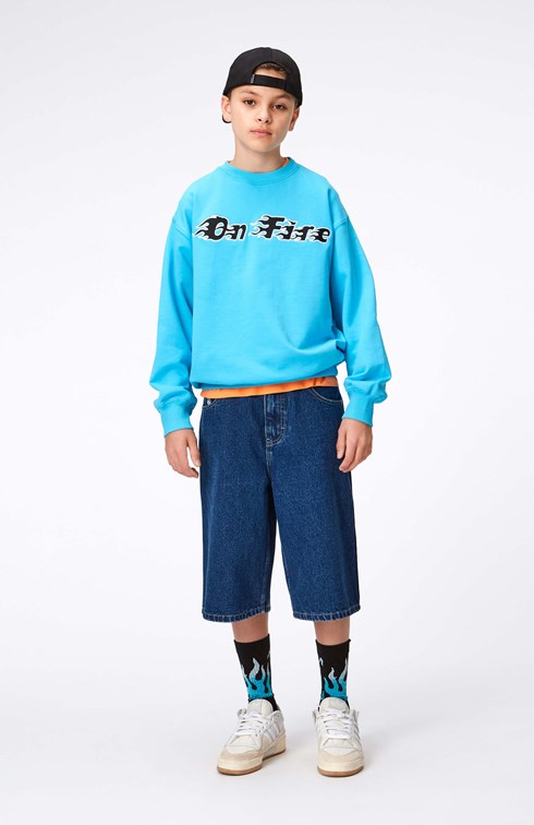 "Lange shorts i mørkeblå denim. Shortsene går til skinnebenet, en løs pasform, har lommer i siden og baglommer. Livvidden på disse shorts kan justeres med en indvendig justerbar elastik, så de passer perfekt til alle børn. Str.92-134 har trykknap, så bukserne er nemme at få af og på - str.140-176 har regulær jeansknap.
