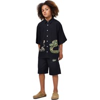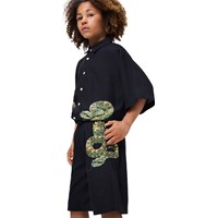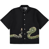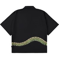 Sort skjorte i blød viskose med brede T-shirt-ærmer, klassisk skjortekrave og knappelukning foran. Skjorten har en oversize pasform med et slangeprint, der strækker sig fra fronten og om på ryggen.