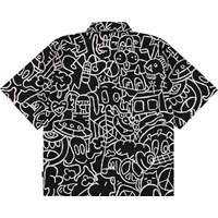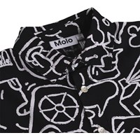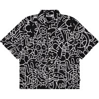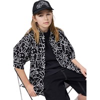 Sort skjorte i blød, økologisk bomuld med brede T-shirt-ærmer, klassisk skjortekrave og knappelukning foran. Skjorten har en oversize pasform med et kunstnerisk og fantasifuldt print.