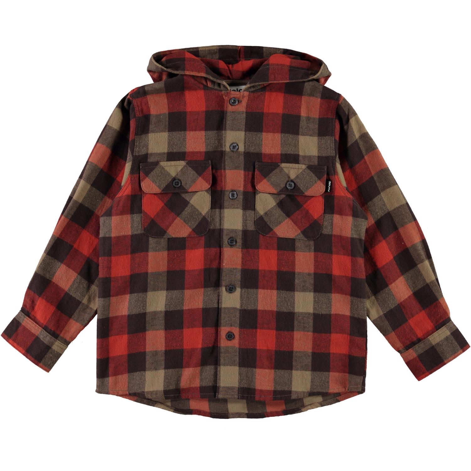 Rizz er en rød og brun ternet skjorte med hætte. Skjorten har kanppelukning på fronten, samt frontlommer på brystet.