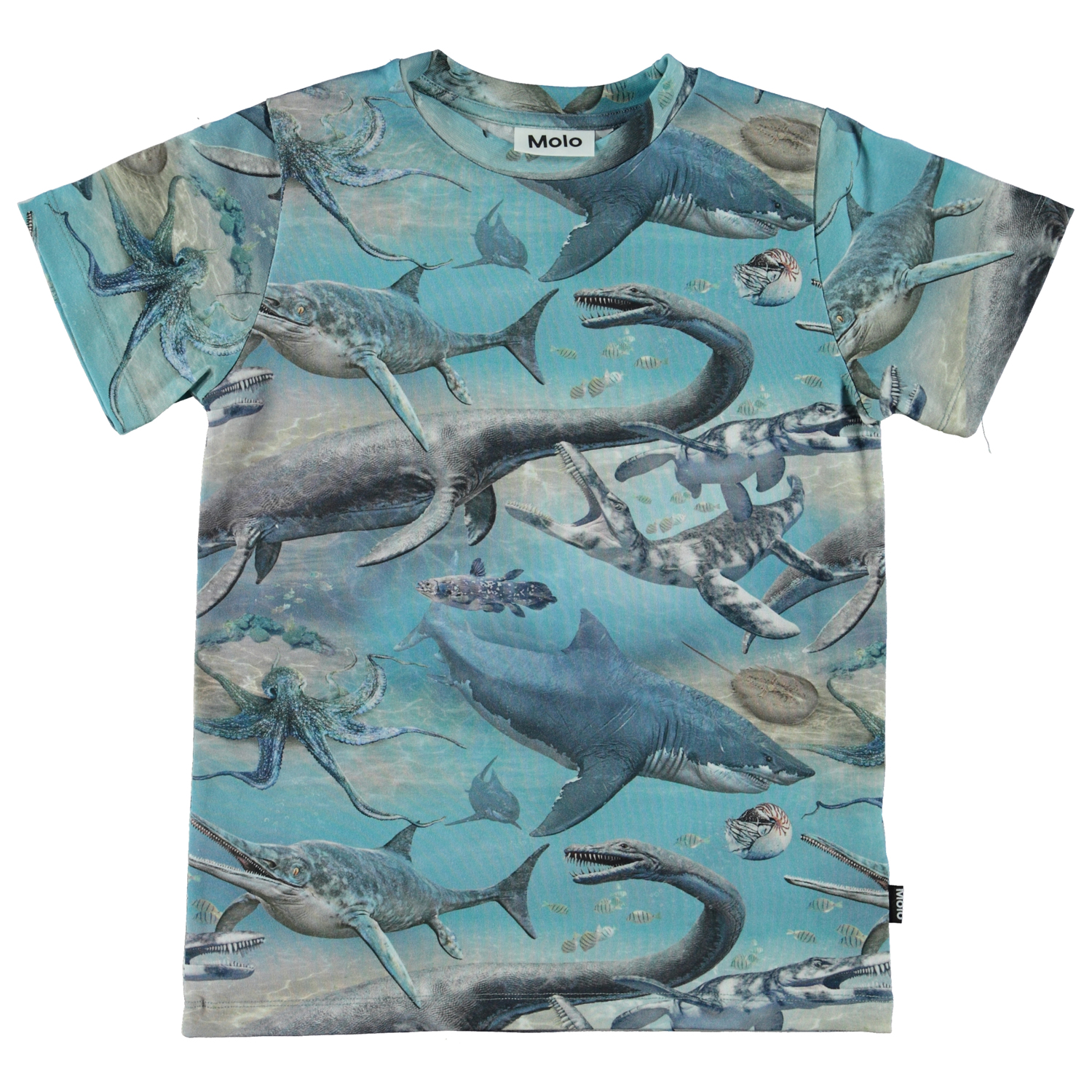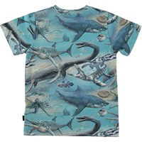 Ralphie er en blå t-shirt med print af forhistoriske dyr, som lever under havets overflade.