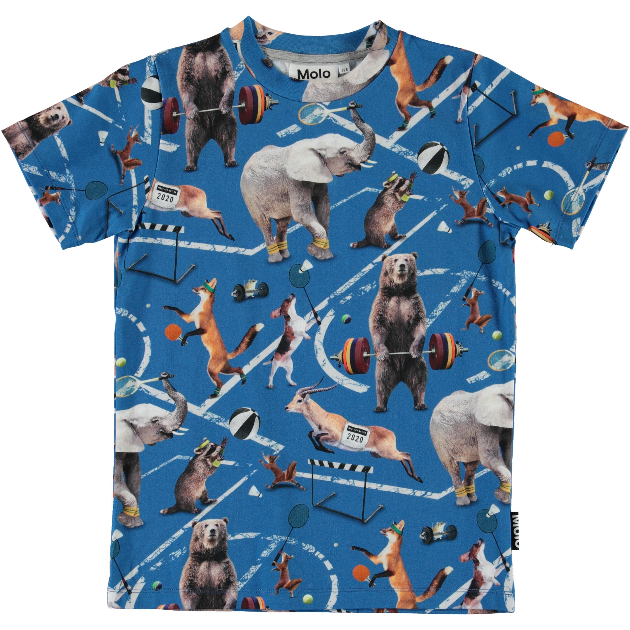Ralphie er en lyseblå t-shirt med all-over print af seje dyr som dyrker forskellige slags sport.