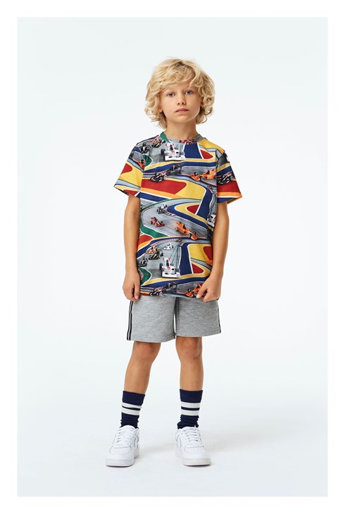 Ralphie er en t-shirt med farverigt all-over print af racerbiler i fuld fart som kører om kap mod hinanden.